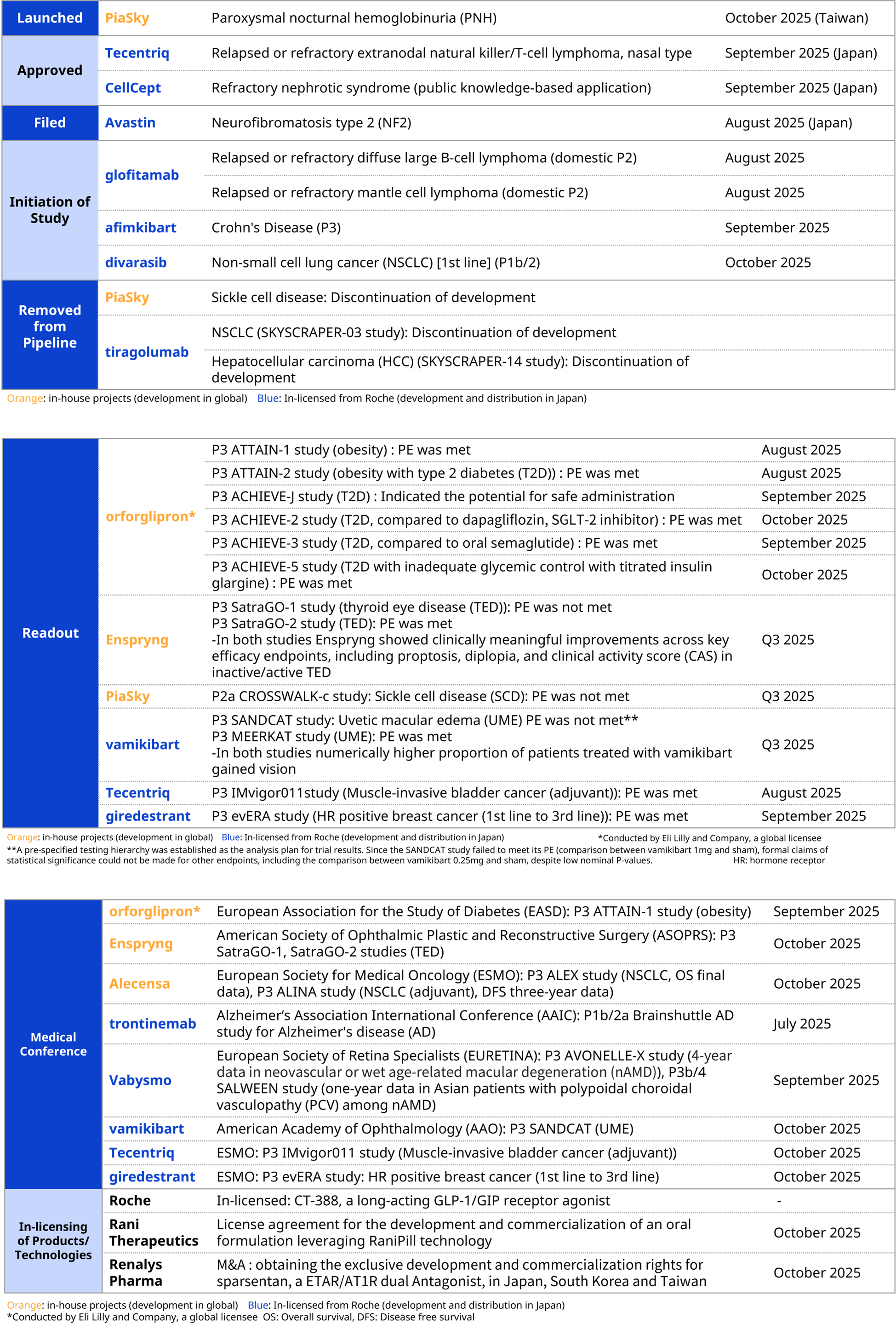For in-house products, PiaSky was launched in Taiwan as the first subcutaneous formulation for paroxysmal nocturnal hemoglobinuria. Enspryng has obtained results from Phase III clinical trials for thyroid eye disease, and will be discussed with health authorities. For Chugai originated project, Orforglipron, an oral GLP-1 receptor agonist out-licensed to Eli Lilly, met primary endpoints in multiple Phase III clinical trials for obesity and type 2 diabetes.