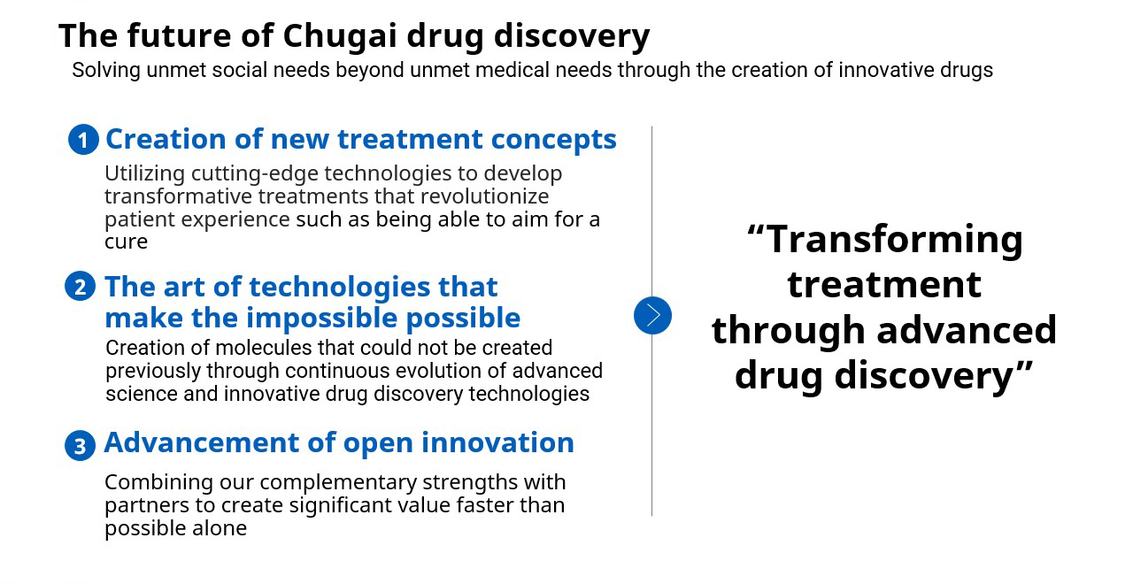 Igawa outlined Chugai's approach to drug discovery, explaining that under the company’s R&D Principles - which set out our research and development philosophy and guiding behaviors - Chugai pursues a Technology-Driven, Quality-Centric model of innovation. "Our goal is not simply to address unmet medical needs," he said. "We want to drive a paradigm shift that fundamentally transforms healthcare and develops therapies that resolve unmet social needs." He introduced three directions guiding Chugai's drug discovery going forward, expressed through the phrase: "Changing treatment through drug discovery."