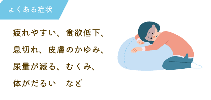 また、溶血により赤血球から流れ出たヘモグロビンが腎臓を通るときに腎臓を傷つけてしまい、腎臓の機能を障害してしまいます。よくある症状疲れやすい、食欲低下、息切れ、皮膚のかゆみ、尿量が減る、