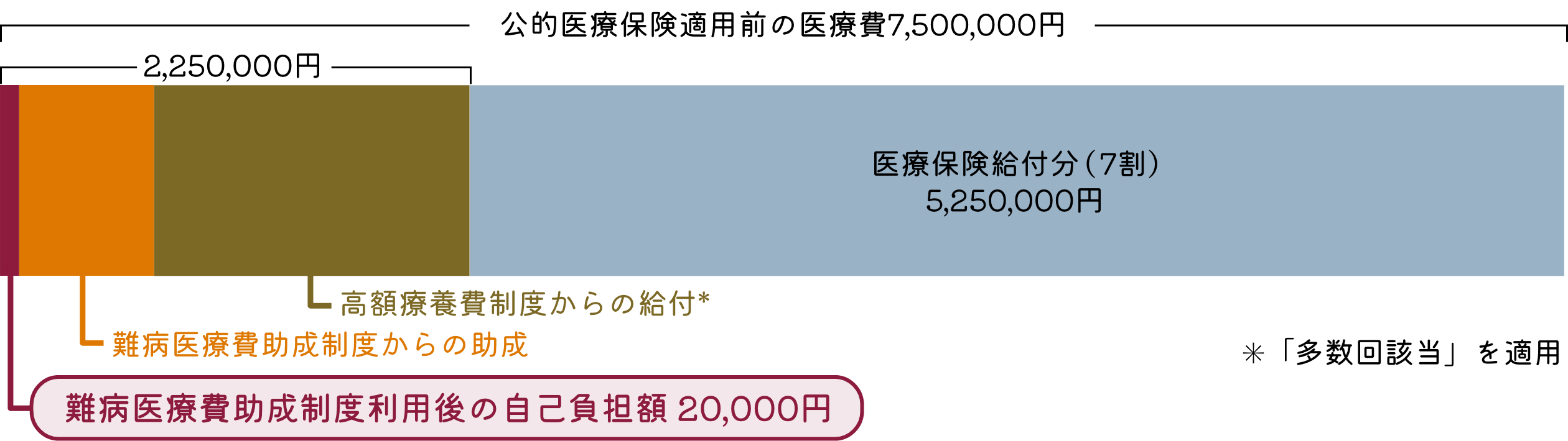 Aさんは過去12ヵ月以内に計3回以上高額療養費の給付を受けているため、高額療養費制度の「多数回該当」の対象となります。また、AさんのPNH治療に対する1ヵ月の公的医療保険適用前の医療費は750万円であり、治療6ヵ月時点で「ひと月の公的医療保険適用前の医療費が50,000円を超える月が支給認定申請月以前の12ヵ月以内に6回以上ある」という「高額かつ長期」の条件を満たします。