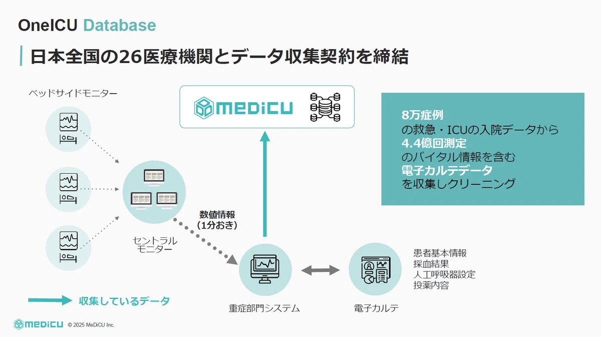 ただし個々の医師が、同じ意味の病名に対して違う書き方をする表記の揺れは、この先も変わらないと予想されます。例えば、「くも膜下出血」という病名の「くも」を片仮名で書くのか、平仮名で書くのか、あるいは英語のsubarachnoid hemorrhage と書くのか、略語のSAHと書くのかという場合です。これらをすべて一つの病名として統一したデータに変換する作業は、電子カルテ由来のデータを使う限りは欠かせません。色々な様式の記載を、独自の自然言語処理の技術を用いて一つの規格に落とし込み、最終的にはICDコードという標準病名コードにまで持っていくというエンジニアリングを、1年ほどかけて開発しています。多様な医療機関で、多様な医療従事者が入力しているデータを、同じ形式で提供できることがOneICUの強みです。2025年1月時点で、参加契約された全国の医療機関は26施設。昨年1年間で26施設なので、2週間に1施設となり、現在もほぼ同じペースで増えています。