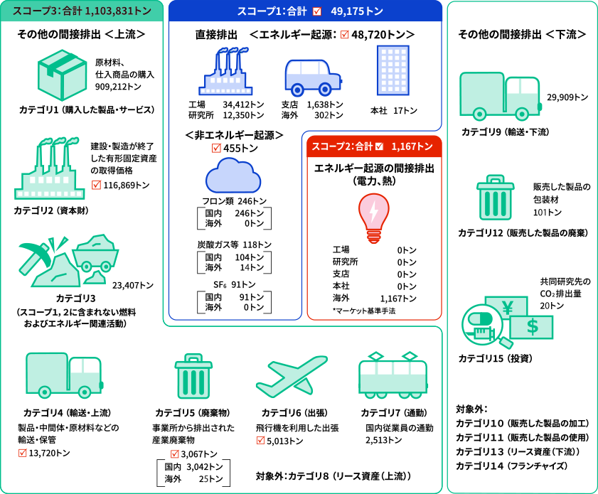 なお、エネルギーおよびCO2排出量算定に用いた各種係数および各スコープ・カテゴリの算定範囲はサステナビリティに関するデータ集2025に掲載しています。