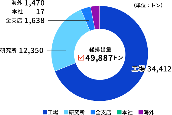 最も排出量の多い機能は生産拠点である工場で34,412トン、次いで研究所12,350トン、全支店1,638トン、本社17トンとなっています。また海外の研究・生産・営業拠点合計で1,470トン排出しています。