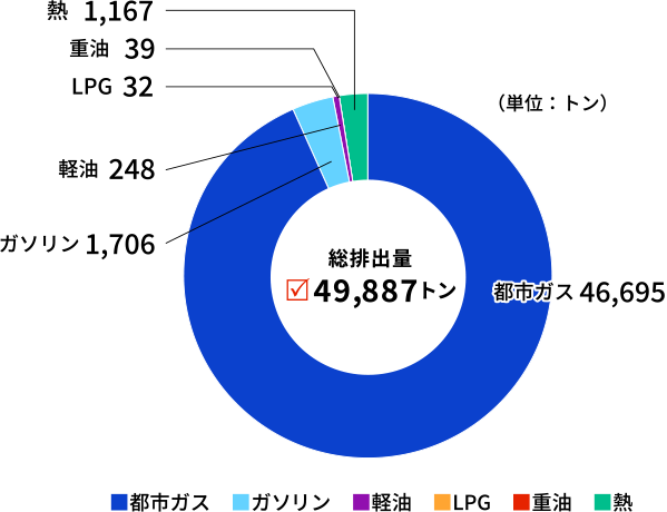 最も排出量の多いエネルギー種は都市ガスで46,695トン、次いでガソリン1,706トン、熱1,167トン、軽油248トン、重油39トン、LPG32トンとなっています。電力はすべてサステナブル電力への転換を行い、排出量は0トンとなりました。