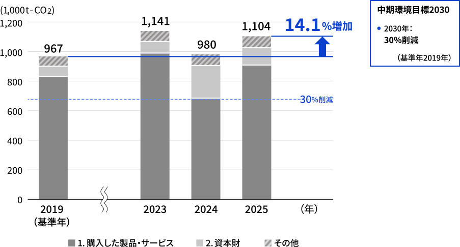 2025年のスコープ3排出量は、基準年比14.1%増の1,103,831トンでした。カテゴリ1(購入した製品・サービス)では、製品・サービスの購入量が増加し、前年比32.8%増加しています。2024年のカテゴリ2(資本財)の増加は、浮間・藤枝の新棟建設に起因するものです。サステナブルな社会の実現のためには、サプライチェーン全体でのCO2排出量の削減が重要だと考えています。そのため、2030年までに基準年比30%削減という目標を設定し、CO2排出量削減目標を設定していないサプライヤーに対し、削減目標設定とその実施を働きかけていきます。