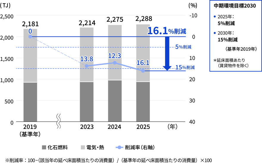 引き続き、本2030年目標(延床面積あたり2019年比15%削減)の達成に向けて、高エネルギー効率設備の導入、燃料転換、日々の事業活動における省エネ運動等によりエネルギー消費量を削減する取り組みを進めていきます。