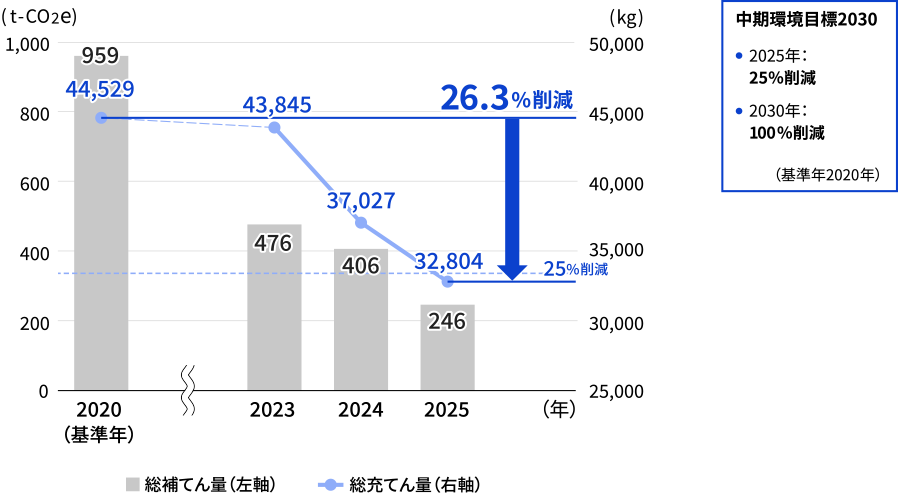 | フロン類使用量 | 2025年:25%削減 2030年:100%削減 (基準年2020年) |